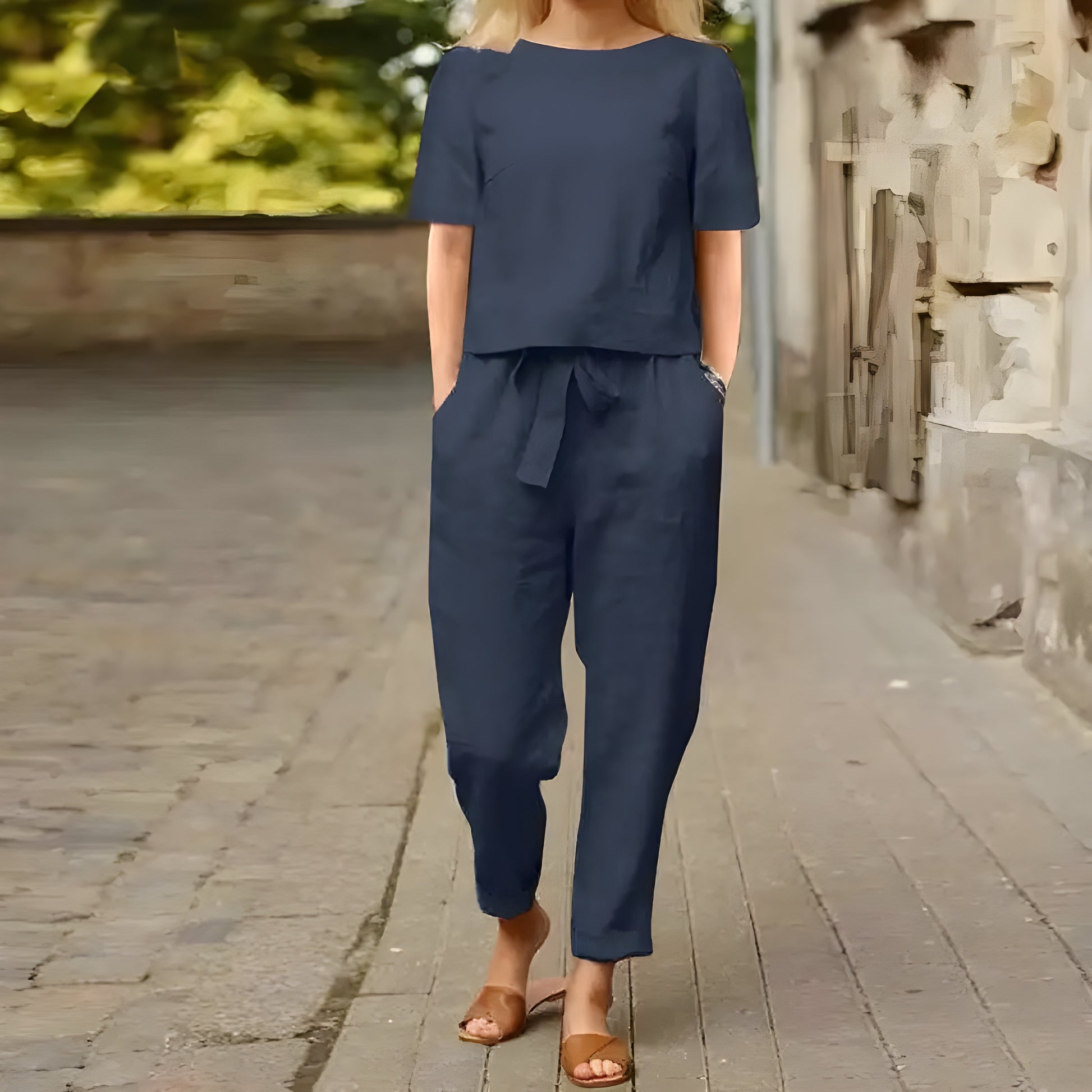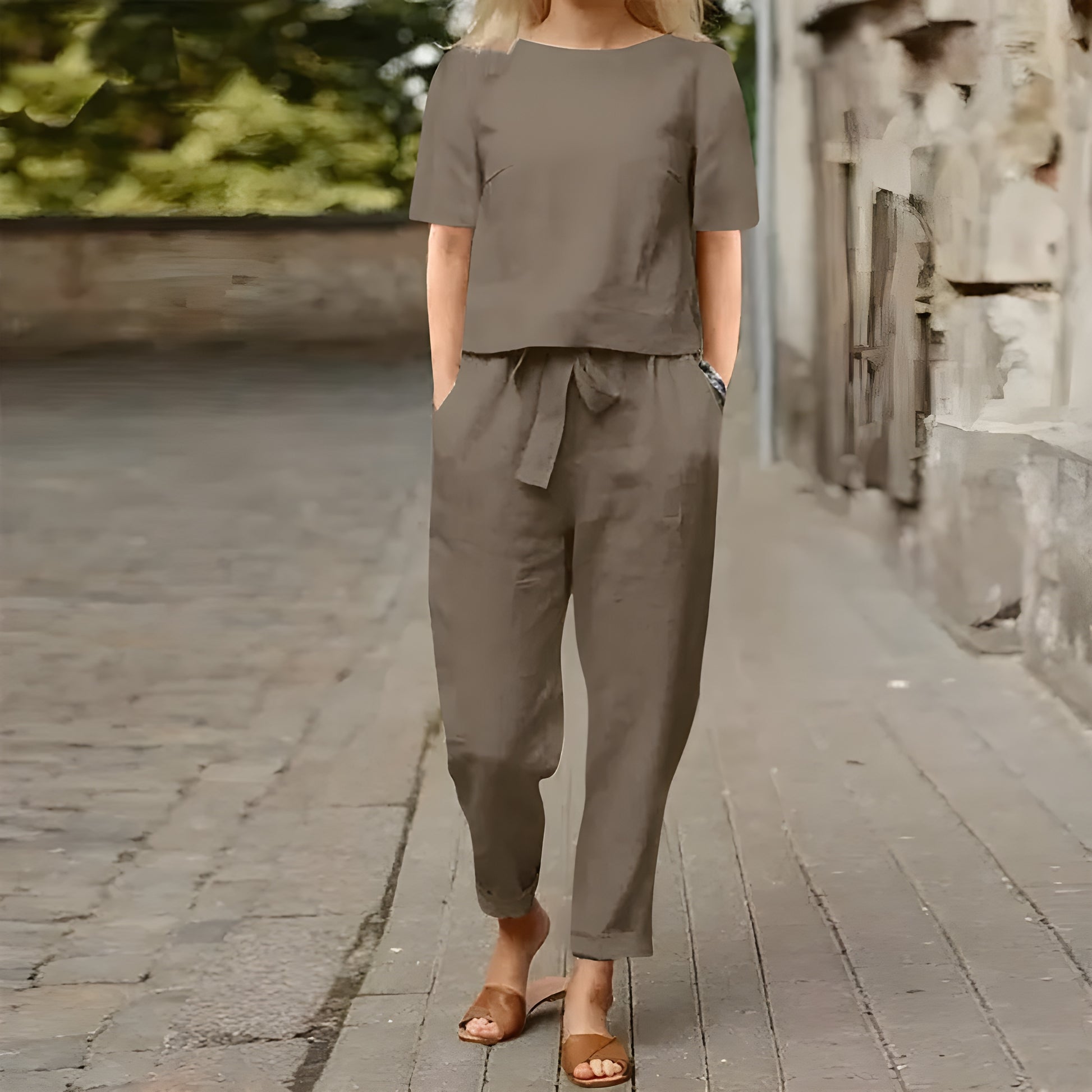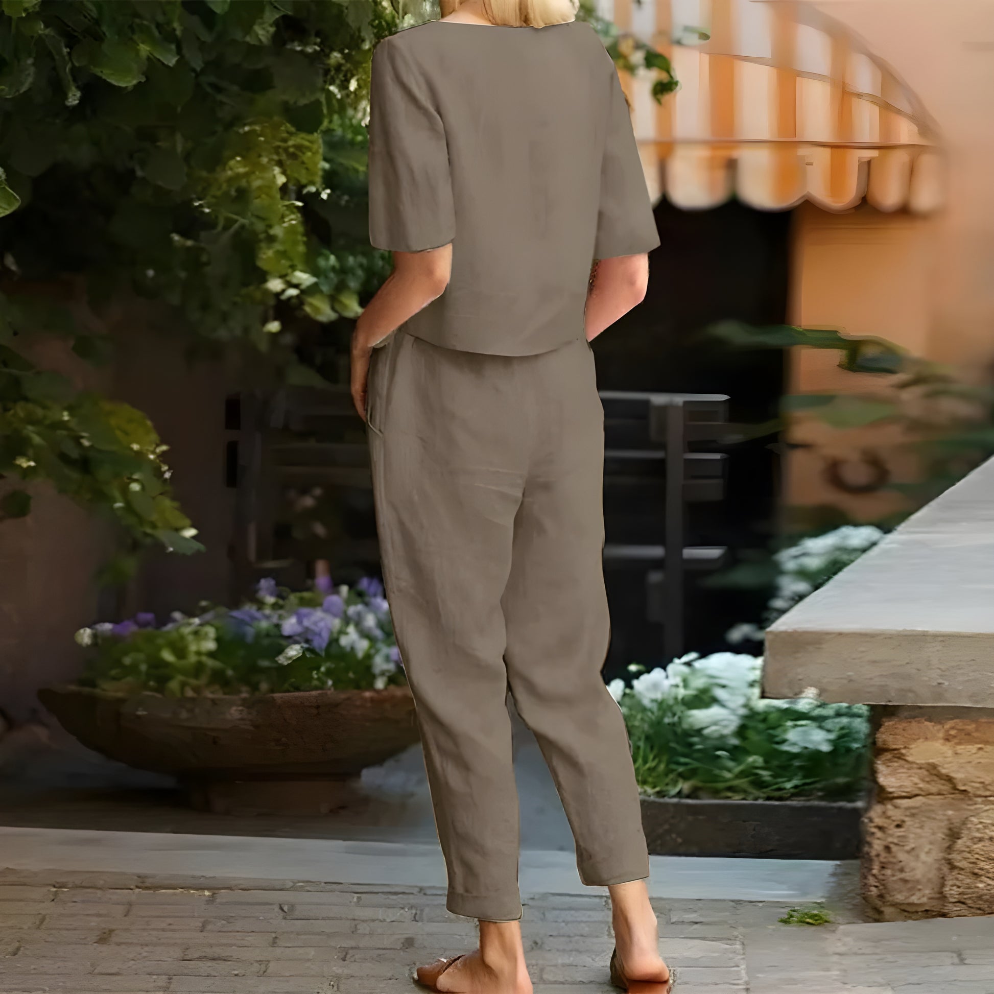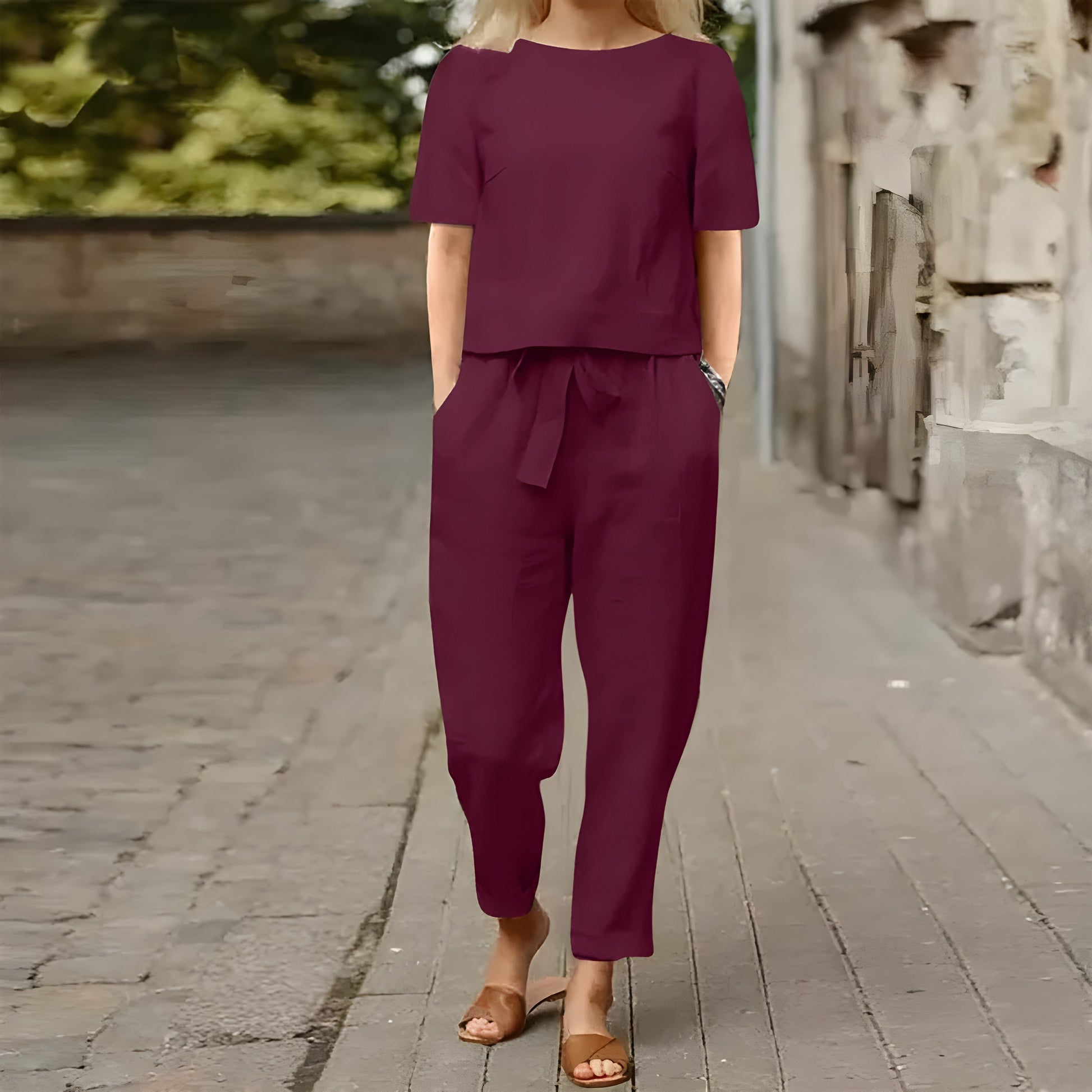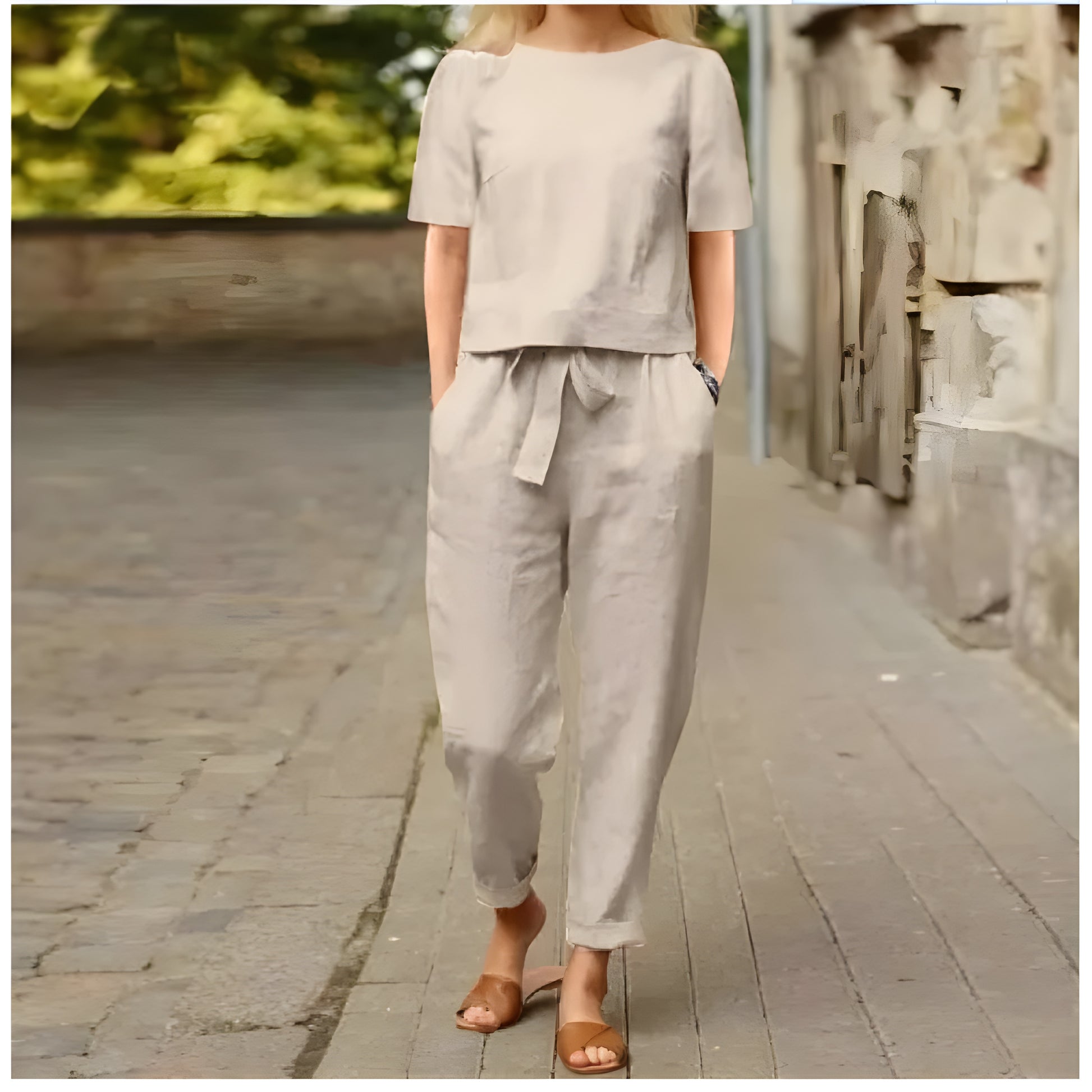 Föreställ dig att du går ut genom dörren, självsäker och bekväm, i en outfit som ser noggrant utvald ut men känns som din favoritsloungeklädsel. Freja™ är din nya favorit – en stilren kombination av en smickrande topp och perfekt matchande byxor, designad för kvinnor som vill ha både komfort och elegans, utan kompromisser.